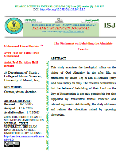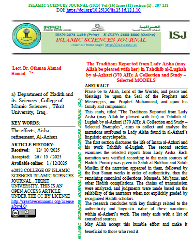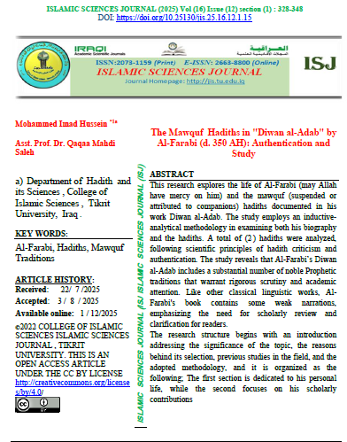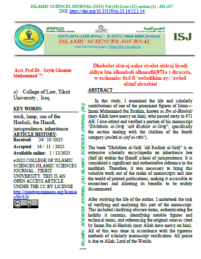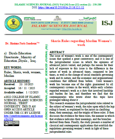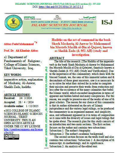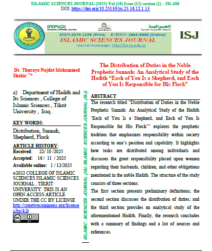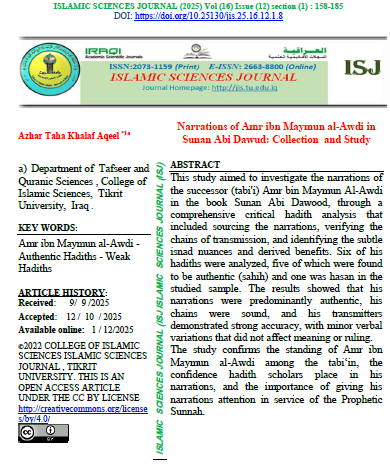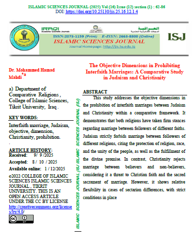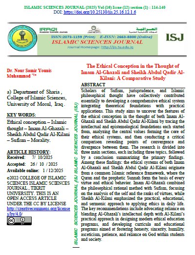 Islamic Sciences Journal (ISJ) (ISSN 2073-1159 (print) or 2663-8800 (online)) is a scientific journal with A double-blind peer-reviewing system. It was established in 2009. It specializes in publishing research, verified manuscripts, extracts from theses and dissertations, as well as reports of scientific seminars and conferences presented in Arabic by Iraqi and foreign researchers in the field of Sharia and Islamic sciences from religions, belief, Islamic thought, and Islamic jurisprudence, which makes it a beacon for all seekers of knowledge and facts embodied in Islamic sciences. The journal is published by Tikrit University, College of Islamic Sciences for the Iraqi Ministry of Higher Education, Research, and Scientific. Islamic Sciences Journal (ISJ) is published four issues a year. |